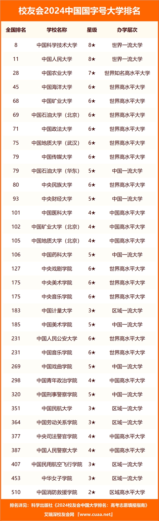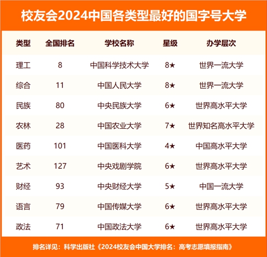 榜單顯示,在校友會2024中國大學(xué)排名上榜的國字號大學(xué)中,中國科學(xué)技術(shù)大學(xué)綜合辦學(xué)實力最強、辦學(xué)水平最高,全國排名第8名,雄居校友會2024中國國字號大學(xué)排名冠軍。中國人民大學(xué)第2,全國排名第11名;中國科學(xué)技術(shù)大學(xué)、中國人民大學(xué)榮膺2024中國八星級大學(xué)(8★)美譽,躋身世界一流大學(xué)行列。