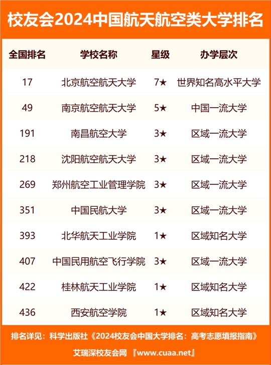 | 校友會(huì)2024中國(guó)航天航空類大學(xué)排名,北京航空航天大學(xué)、南京航空航天大學(xué)金城學(xué)院第一 |