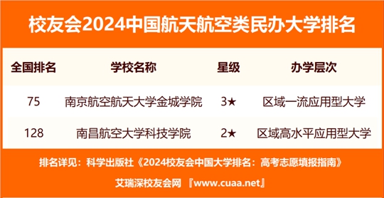 在校友會(huì)2024中國(guó)民辦大學(xué)排名中,南京航空航天大學(xué)金城學(xué)院綜合辦學(xué)實(shí)力排名最高、辦學(xué)水平最高,全國(guó)排名第75名,奪得校友會(huì)2024中國(guó)航天航空類民辦大學(xué)排名首位。南昌航空大學(xué)科技學(xué)院第2,排名全國(guó)第128名。