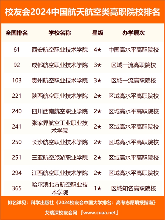 在校友會(huì)2024中國(guó)高職院校排名中,西安航空職業(yè)技術(shù)學(xué)院辦學(xué)實(shí)力最強(qiáng)、最具核心競(jìng)爭(zhēng)力,全國(guó)排名第61名,位居校友會(huì)2024中國(guó)航天航空類高職院校排名榜首。成都航空職業(yè)技術(shù)學(xué)院第2,排名全國(guó)第92名。貴州航空職業(yè)技術(shù)學(xué)院第3,排行全國(guó)第103名。陜西航空職業(yè)技術(shù)學(xué)院第4,位列全國(guó)第221名。四川西南航空職業(yè)學(xué)院第5,排名全國(guó)第240名。張家界航空工業(yè)職業(yè)技術(shù)學(xué)院第6,位居全國(guó)第241名。長(zhǎng)沙航空職業(yè)技術(shù)學(xué)院第7,位居全國(guó)第250名。三亞航空旅游職業(yè)學(xué)院第8,排行全國(guó)第251名。江西航空職業(yè)技術(shù)學(xué)院第9,排行全國(guó)第294名。哈爾濱北方航空職業(yè)技術(shù)學(xué)院第10,排行全國(guó)第365名。