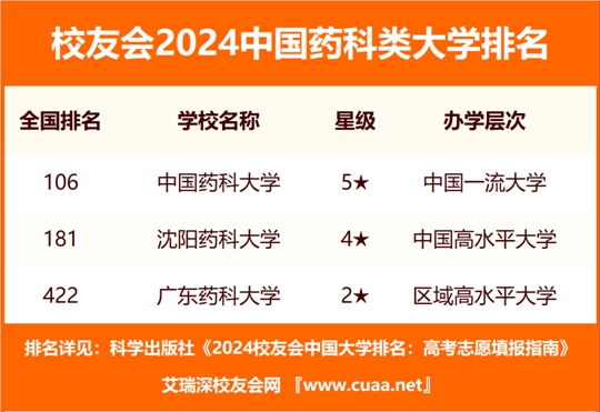 為了給2024年全國高考考生選擇填報中國藥科類院校提供參考,2024年1月16日,全國第三方大學(xué)評價機(jī)構(gòu)艾瑞深校友會網(wǎng)(Cuaa.net)正式公布《2024校友會中國大學(xué)排名:高考志愿填報指南》,發(fā)布最新校友會2024中國藥科類大學(xué)排名,該書將由科學(xué)出版社公開出版發(fā)行。