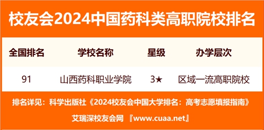 在校友會2024中國高職院校排名中,山西藥科職業(yè)學(xué)院辦學(xué)實力最強(qiáng),全國排名第91名,位列校友會2024中國藥科類高職院校排名第一。