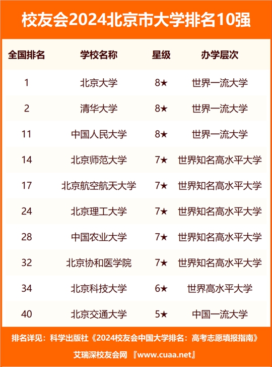 為給2024年全國高考考生選擇填報北京市高校提供參考,2024年1月16日,全國第三方大學(xué)評價機(jī)構(gòu)艾瑞深校友會網(wǎng)(Cuaa.net)正式公布《2024校友會中國大學(xué)排名:高考志愿填報指南》,發(fā)布最新校友會2024北京市大學(xué)排名,該書將由科學(xué)出版社公開出版發(fā)行。