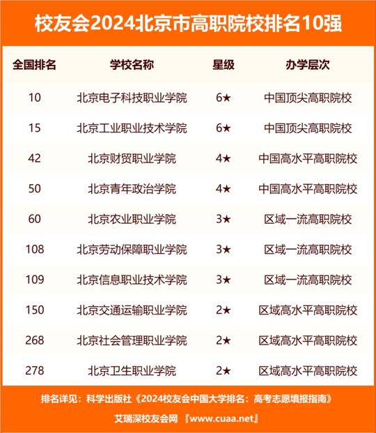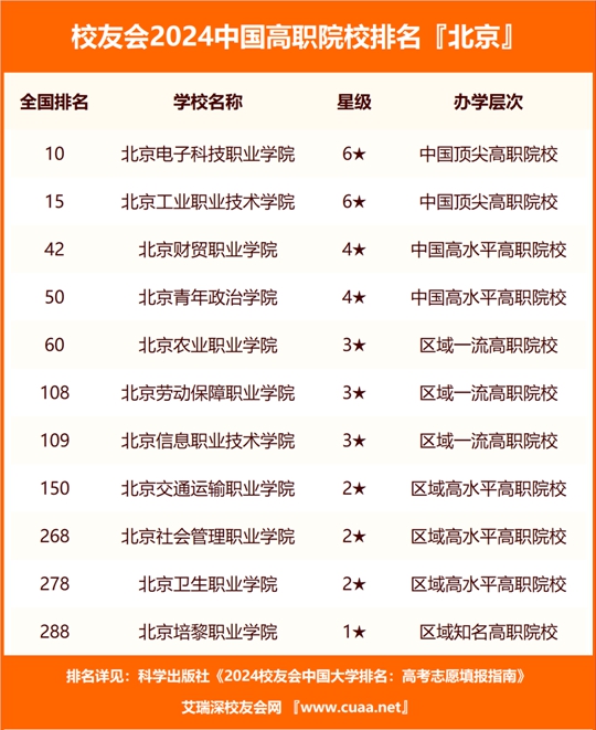 在最新校友會2024北京市高職院校排名中,北京電子科技職業(yè)學(xué)院(全國第10名)第1,北京工業(yè)職業(yè)技術(shù)學(xué)院(全國第15名)第2,北京財貿(mào)職業(yè)學(xué)院(全國第42名)第3,北京青年政治學(xué)院(全國第50名)第4,北京農(nóng)業(yè)職業(yè)學(xué)院(全國第60名)第5,北京勞動保障職業(yè)學(xué)院(全國第108名)第6,北京信息職業(yè)技術(shù)學(xué)院(全國第109名)第7,北京交通運輸職業(yè)學(xué)院(全國第150名)第8,北京社會管理職業(yè)學(xué)院(全國第268名)第9,北京衛(wèi)生職業(yè)學(xué)院(全國第278名)第10。