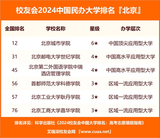 在最新校友會2024北京市民辦大學(xué)排名中,北京城市學(xué)院(全國第12名)第1,北京郵電大學(xué)世紀(jì)學(xué)院(全國第31名)第2,北京第二外國語學(xué)院中瑞酒店管理學(xué)院(全國第45名)第3,首都師范大學(xué)科德學(xué)院(全國第56名)第4,北京工業(yè)大學(xué)耿丹學(xué)院(全國第57名)第5,北京工商大學(xué)嘉華學(xué)院(全國第76名)第6。
