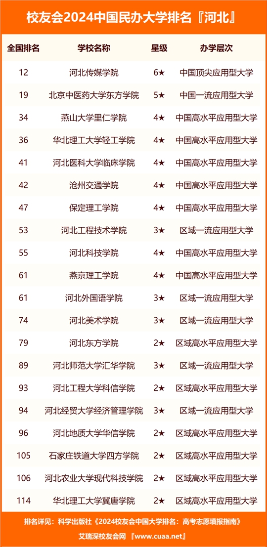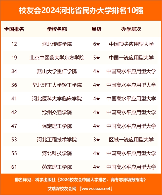 在最新校友會2024河北省民辦大學(xué)排名中,河北傳媒學(xué)院(全國第12名)第1,北京中醫(yī)藥大學(xué)東方學(xué)院(全國第19名)第2,燕山大學(xué)里仁學(xué)院(全國第34名)第3,華北理工大學(xué)輕工學(xué)院(全國第36名)第4,河北醫(yī)科大學(xué)臨床學(xué)院(全國第41名)第5,滄州交通學(xué)院(全國第42名)第6,保定理工學(xué)院(全國第47名)第7,河北工程技術(shù)學(xué)院(全國第53名)第8,河北科技學(xué)院(全國第55名)第9,燕京理工學(xué)院(全國第61名)第10,河北外國語學(xué)院(全國第61名)第10。