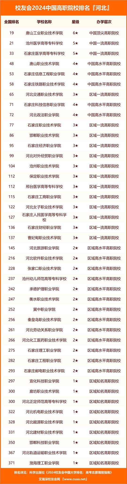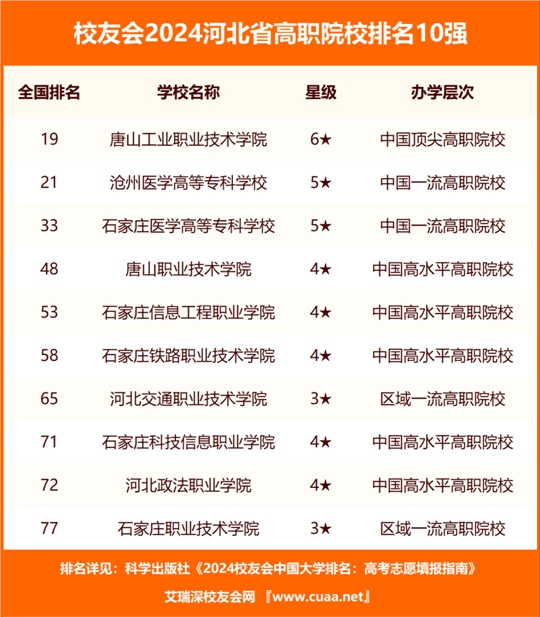 在最新校友會2024河北省高職院校排名中,唐山工業(yè)職業(yè)技術(shù)學(xué)院(全國第19名)第1,滄州醫(yī)學(xué)高等專科學(xué)校(全國第21名)第2,石家莊醫(yī)學(xué)高等專科學(xué)校(全國第33名)第3,唐山職業(yè)技術(shù)學(xué)院(全國第48名)第4,石家莊信息工程職業(yè)學(xué)院(全國第53名)第5,石家莊鐵路職業(yè)技術(shù)學(xué)院(全國第58名)第6,河北交通職業(yè)技術(shù)學(xué)院(全國第65名)第7,石家莊科技信息職業(yè)學(xué)院(全國第71名)第8,河北政法職業(yè)學(xué)院(全國第72名)第9,石家莊職業(yè)技術(shù)學(xué)院(全國第77名)第10。