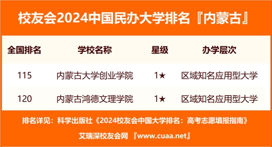 內(nèi)蒙古大學創(chuàng)業(yè)學院雄居2024內(nèi)蒙古自治區(qū)民辦大學排名第一,內(nèi)蒙古鴻德文理學院第二