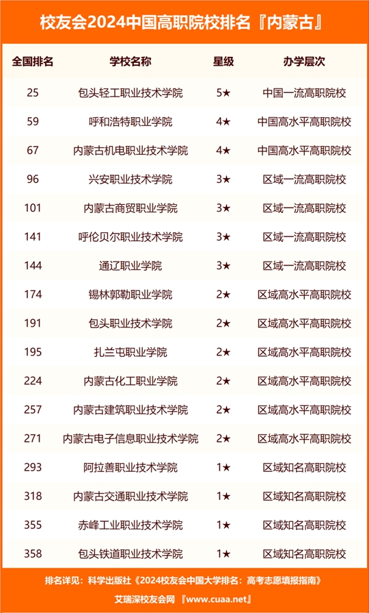 在最新校友會2024內(nèi)蒙古自治區(qū)高職院校排名中,包頭輕工職業(yè)技術學院(全國第25名)第1,呼和浩特職業(yè)學院(全國第59名)第2,內(nèi)蒙古機電職業(yè)技術學院(全國第67名)第3,興安職業(yè)技術學院(全國第96名)第4,內(nèi)蒙古商貿(mào)職業(yè)學院(全國第101名)第5,呼倫貝爾職業(yè)技術學院(全國第141名)第6,通遼職業(yè)學院(全國第144名)第7,錫林郭勒職業(yè)學院(全國第174名)第8,包頭職業(yè)技術學院(全國第191名)第9,扎蘭屯職業(yè)學院(全國第195名)第10。