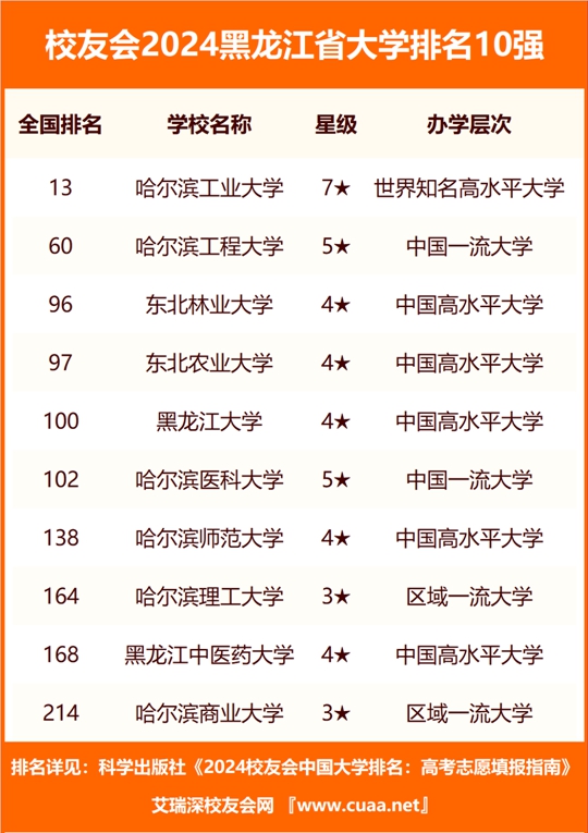 為給2024年全國高考考生選擇填報黑龍江省高校提供參考,2024年1月16日,全國第三方大學(xué)評價機構(gòu)艾瑞深校友會網(wǎng)(Cuaa.net)正式公布《2024校友會中國大學(xué)排名:高考志愿填報指南》,發(fā)布最新校友會2024黑龍江省大學(xué)排名,該書將由科學(xué)出版社公開出版發(fā)行。