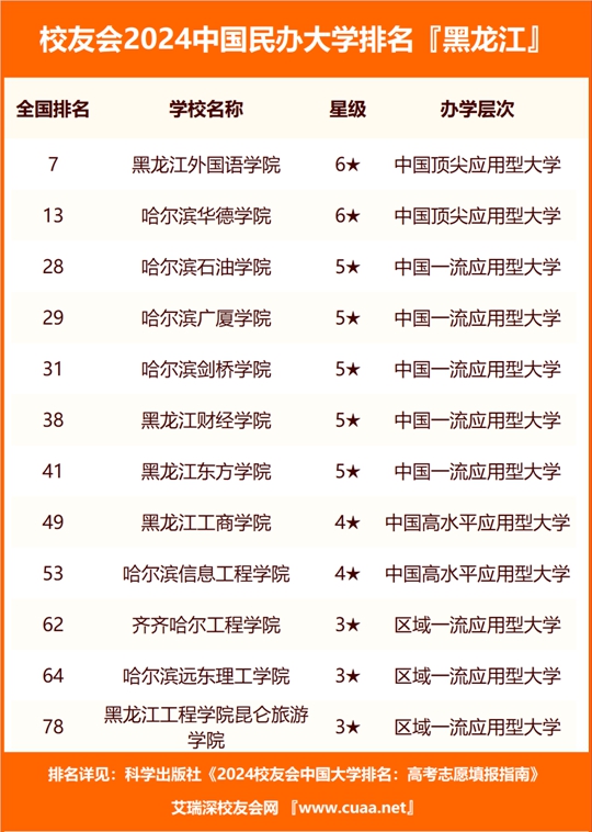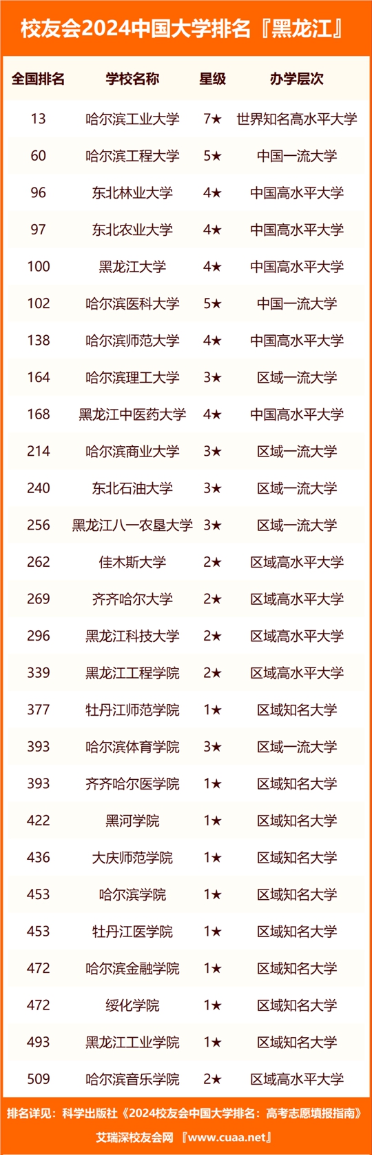 | 校友會2024黑龍江省大學(xué)排名,哈爾濱工業(yè)大學(xué)、黑龍江外國語學(xué)院、黑龍江職業(yè)學(xué)院第一 |