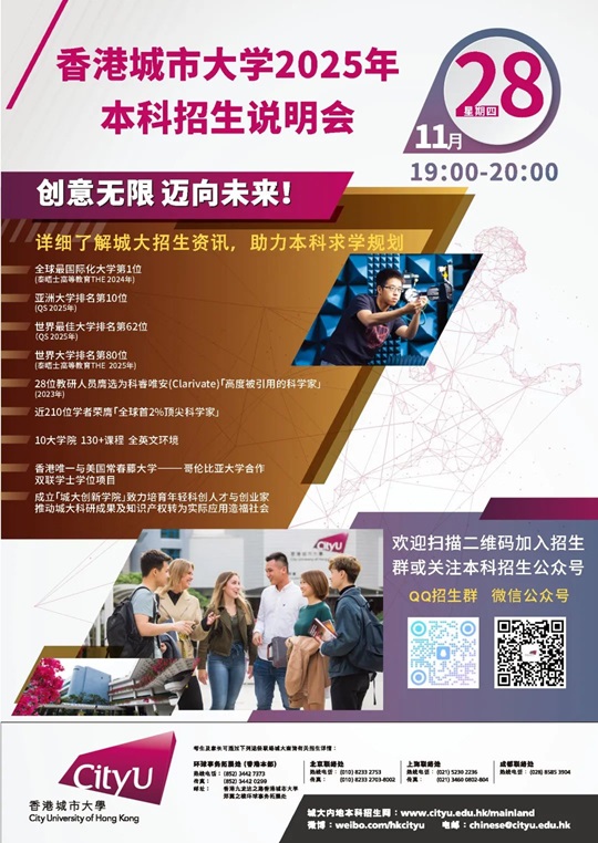 香港城市大學(xué)2025內(nèi)地本科招生宣講會?趫黾磳⑴e行!