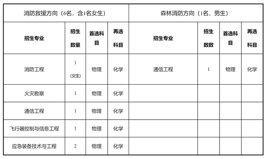 2024年中國消防救援學(xué)院計(jì)劃在河北省招收青年學(xué)生7名(男生6名、女生1名),招生計(jì)劃列在本科提前批A段,錄取分?jǐn)?shù)不低于河北省特殊類型招生錄取控制分?jǐn)?shù)線。未被錄取的考生,不影響在后續(xù)批次被其他高校錄取。具體招生數(shù)量和選科要求如下: