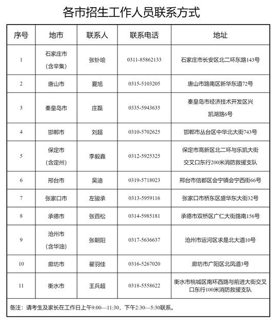 學(xué)院專業(yè)介紹、錄取規(guī)則、入學(xué)待遇和畢業(yè)就業(yè)等政策詳見中國消防救援學(xué)院招生網(wǎng)(https://www.cfri.edu.cn/zs)公布的《中國消防救援學(xué)院2024年招收青年學(xué)生章程》和《中國消防救援學(xué)院2024年招生簡章》。中國消防救援學(xué)院在河北招生工作實(shí)行“陽光工程”,不委托任何中介機(jī)構(gòu)招生,河北省消防員招錄工作辦公室專門設(shè)立招生咨詢和舉報電話(0311-89181222,工作日上午9:00—11:30,下午2:30—5:30),接受社會各界監(jiān)督。