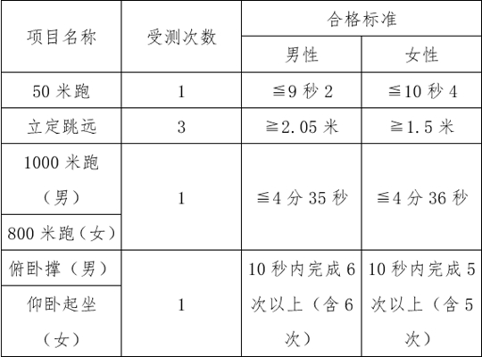 以上4個(gè)項(xiàng)目須全部進(jìn)行測(cè)試,其中有3個(gè)及以上達(dá)標(biāo)的,體能測(cè)試結(jié)論為合格。體能測(cè)試實(shí)行全程錄像。