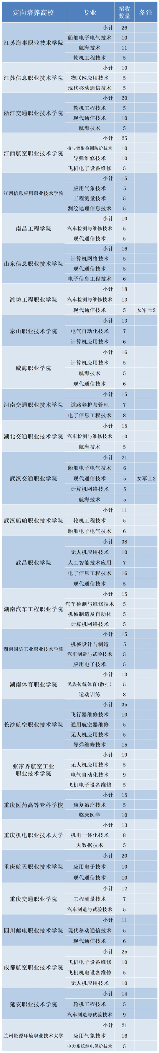 定向培養(yǎng)軍士招生錄取工作,納入普通高等學(xué)校招生全國統(tǒng)一考試實施,執(zhí)行專科提前批錄取政策。