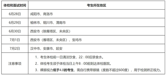 面試和體格檢查同步展開,由省軍區(qū)招生工作辦公室牽頭協(xié)調(diào),依托空軍軍醫(yī)大學(xué)組織實施,承檢醫(yī)療機構(gòu)為空軍第九八六醫(yī)院(北區(qū)),地址為西安市碑林區(qū)友誼東路269號。參加面試、體格檢查的考生須攜帶第二代居民身份證、準(zhǔn)考證、學(xué)籍所在高中出具的高中階段體質(zhì)測試及格證明。參檢前請認(rèn)真閱讀《體檢須知》(見附件1)。