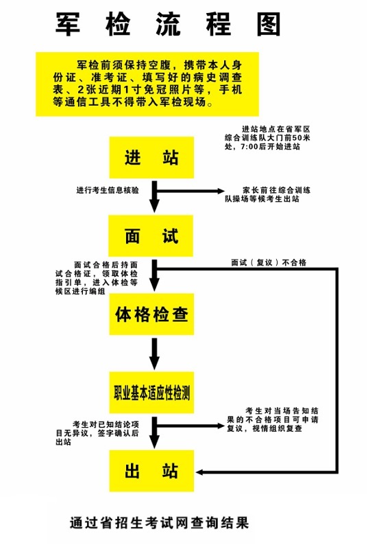 考生進(jìn)入面試區(qū)后,首先查閱軍檢流程圖和面試分組單,然后到面試待試區(qū)對(duì)應(yīng)小組就座,填寫考生信息,依次參加面試。面試合格者,考核組當(dāng)場發(fā)給《面試合格證》,考生憑《面試合格證》進(jìn)行體檢登記,并領(lǐng)取體檢指引單。對(duì)面試不合格的考生,面試考官現(xiàn)場向考生說明不合格原因。考生若對(duì)面試結(jié)果有異議,可向監(jiān)督復(fù)議組申請(qǐng)復(fù)議,由監(jiān)督復(fù)議組作出最終結(jié)論。面試表格中,需考生填寫高中階段體質(zhì)測試綜合評(píng)定成績,請(qǐng)考生提前與就讀學(xué)校確認(rèn)個(gè)人體質(zhì)測試結(jié)果,并對(duì)填寫相關(guān)信息的準(zhǔn)確性和真實(shí)性負(fù)責(zé)。