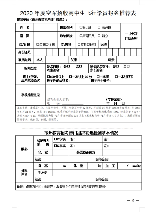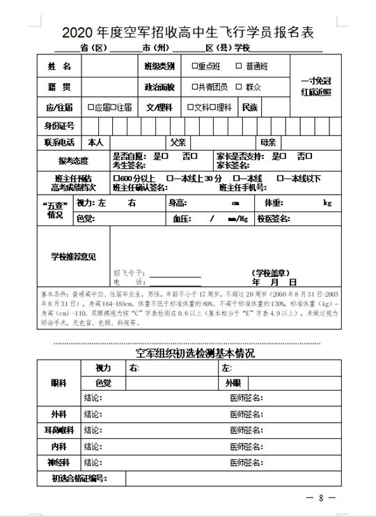 3.2020年度空軍招收高中生飛行學(xué)員報(bào)名推薦表