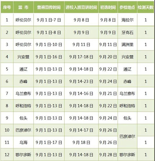。ㄒ唬┍本┻x拔中心在自治區(qū)10個(gè)盟市設(shè)立檢測(cè)站,具體安排如下:
