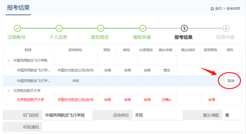 志愿組合填報(bào)完成,經(jīng)初檢、體檢、心理測試,全部都合格后,考生就可以進(jìn)入確認(rèn)有效招飛志愿階段(注意:請不要在未填報(bào)某一志愿組合或未通過某一志愿組合的初檢就參加該志愿組合的體檢),確認(rèn)有效招飛志愿的時(shí)間為2023年2月1日至各送培單位自行設(shè)定的截止日期。請務(wù)必在參加背景調(diào)查之前登陸系統(tǒng)對相應(yīng)的申請組合進(jìn)行確認(rèn)!