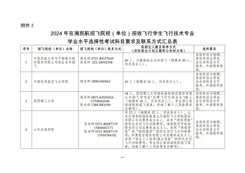 2.2024年在湘民航招飛院校(單位)招收飛行學(xué)生飛行技術(shù)專業(yè)學(xué)業(yè)水平選擇性考試科目要求及聯(lián)系方式匯總表