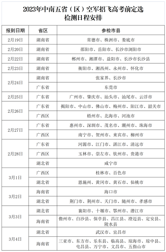 根據(jù)空軍招飛年度安排,空軍定于2月下旬至3月上旬,在湖南長(zhǎng)沙設(shè)站,組織中南五。▍^(qū))高中生進(jìn)行高考前定選檢測(cè)。