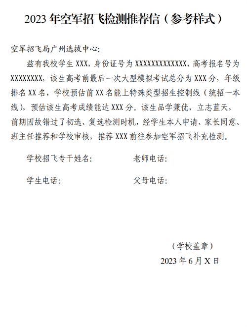 (五)暢通聯(lián)系。當(dāng)前正處空軍招飛定選、投檔錄取的關(guān)鍵階段,請各位學(xué)生、家長保持電話暢通,防止誤時(shí)誤事。
