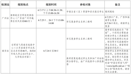 。ㄈ┢渌马(xiàng)。參加廣州站檢測學(xué)生均不安排食宿,隨到隨檢,檢完即可返回;參加南京站定選學(xué)生,報(bào)到后由空軍統(tǒng)一安排食宿。南京定選站不接待帶隊(duì)老師,陪同學(xué)生參檢的學(xué)生家長往返交通食宿費(fèi)用自理。