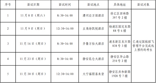 (二)預(yù)選初檢:登錄“國(guó)航招飛管理平臺(tái)”填寫(xiě)信息、預(yù)約場(chǎng)次,已預(yù)約考生嚴(yán)格按照預(yù)約時(shí)間參加國(guó)航招飛辦公室組織的現(xiàn)場(chǎng)初檢面試(含飛行職業(yè)能力傾向測(cè)試、英語(yǔ)測(cè)試、面試等);