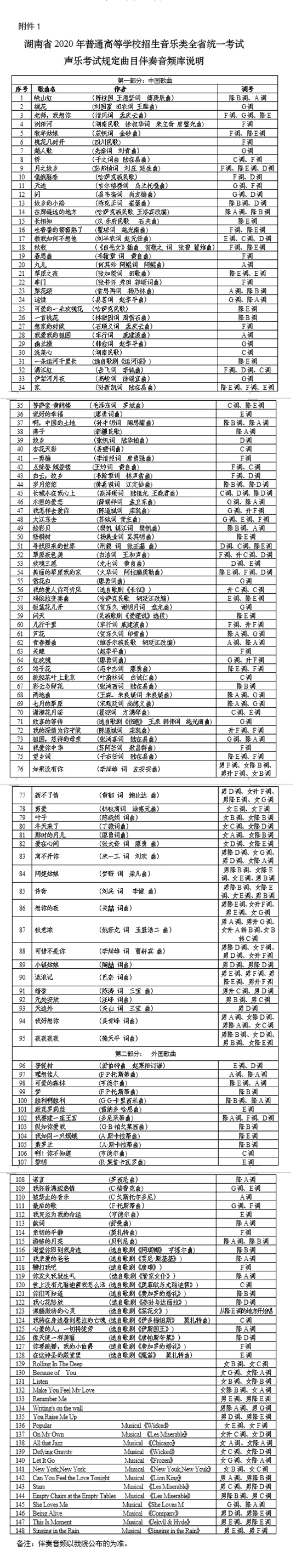 附件:1.湖南省2020年普通高等學(xué)校招生音樂類全省統(tǒng)一考試聲樂考試規(guī)定曲目伴奏音頻庫說明