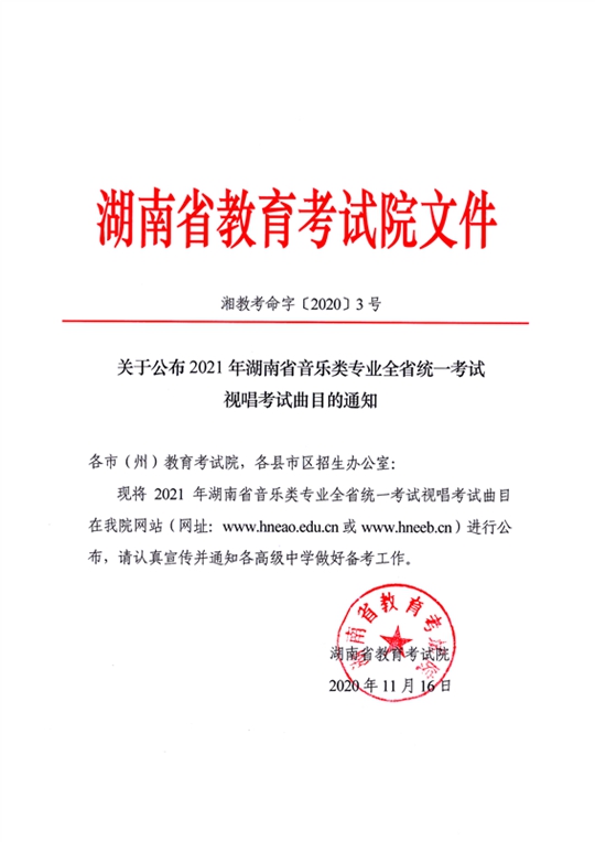 關(guān)于公布2021年湖南省音樂類專業(yè)全省統(tǒng)一考試視唱考試曲目的通知