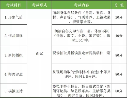 通過(guò)模擬主持廣播、電視、網(wǎng)絡(luò)等電子傳媒中不同類(lèi)型的小欄目,考察考生的角色匹配、主持特質(zhì)、鏡頭形象、語(yǔ)言表現(xiàn)力及親和力、肢體副語(yǔ)言運(yùn)用情況等。