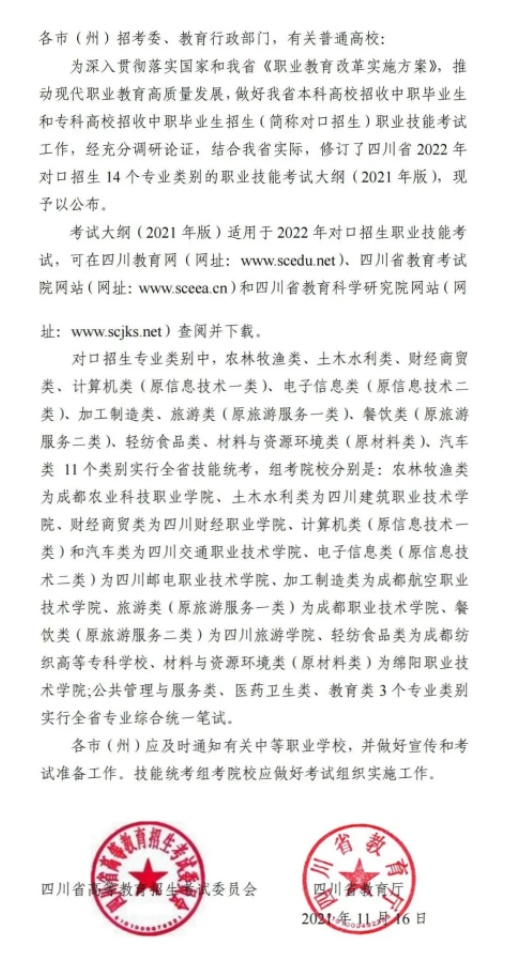 關(guān)于公布四川省2022年普通高校對口招生職業(yè)技能考試大綱的通知