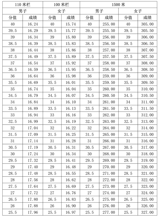 2.男子110米欄、女子100米欄、1500米跑評(píng)分表(單位:秒)
