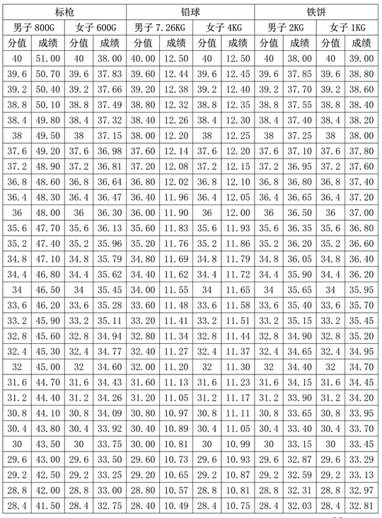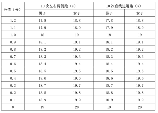 專項(xiàng)素質(zhì)滿分為12分。每項(xiàng)測(cè)驗(yàn)內(nèi)容達(dá)到要求者可得評(píng)分表規(guī)定的滿分。達(dá)不到要求者視其情況扣分。其中達(dá)標(biāo)項(xiàng)目評(píng)分標(biāo)準(zhǔn)為: