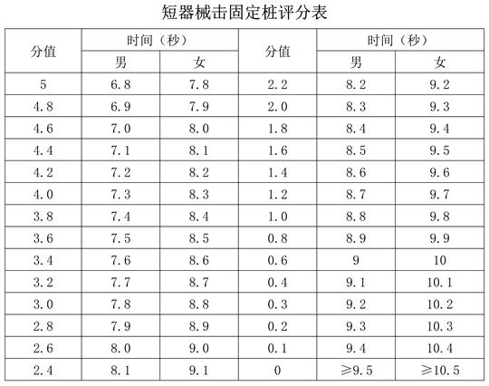 a.用器械(短兵)全長90cm,打六個(gè)固定樁(樁高170cm、直徑40cm)。固定樁分成兩排,一排三個(gè),兩排距離4米,每兩個(gè)相鄰樁距離2米,成“Z”字形排列。每個(gè)樁分別打頭、軀干、大腿三個(gè)固定點(diǎn)。考生站在出發(fā)臺(tái)前,前腳踏住計(jì)時(shí)啟動(dòng)器,準(zhǔn)備好后聽口令自己啟動(dòng)計(jì)時(shí)器,按順序打完三個(gè)樁的固定點(diǎn)后,自己停計(jì)時(shí)器,回到出發(fā)臺(tái)。所用時(shí)間換算成分?jǐn)?shù)就是考生的最終分?jǐn)?shù),每個(gè)考生考2次,取最好成績?忌驑端玫囊苿(dòng)方法不限,漏掉任意一個(gè)點(diǎn)扣1分,依次遞減,直至清零,得分標(biāo)準(zhǔn)和考試方法見下表。