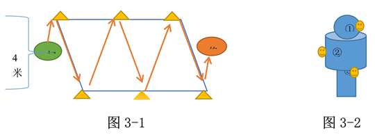 b.考生在起點(diǎn)圈內(nèi)做好準(zhǔn)備后,聽口令開始沿箭頭分別擊打六個(gè)固定樁,打完后、任意一只腳踏進(jìn)終點(diǎn)圈停止計(jì)時(shí)(圖3-1)。圖3-2中標(biāo)示的①②③為打擊的三個(gè)位置,打擊順序不限。