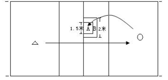 如圖所示。教師在對(duì)方場(chǎng)區(qū)側(cè)手發(fā)球,考生在后場(chǎng)區(qū)6號(hào)位接10個(gè)發(fā)球。要求墊球弧度不低于球網(wǎng),若球的飛行弧度低于球網(wǎng)上沿,則在相應(yīng)得分中扣去0.3分