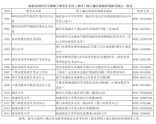 附件:福建省2025年全國(guó)碩士研究生考試(初試)網(wǎng)上確認(rèn)現(xiàn)場(chǎng)咨詢指導(dǎo)地點(diǎn)一覽表