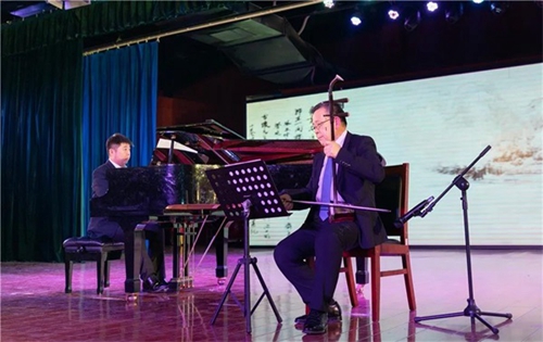 晚上7時(shí),全省第六屆大學(xué)生藝術(shù)展演獲獎(jiǎng)節(jié)目《盛世國樂》為晚會(huì)拉開序幕,來自公共藝術(shù)教育中心的4位青年教師與學(xué)生們共同合奏,整個(gè)樂曲音色典雅、古韻十足、氣勢磅礴,將幾千年前的中華盛世樂曲魅力表現(xiàn)的淋漓盡致,讓師生感受到一段深情并茂的民樂散文。