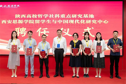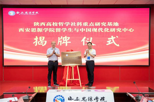 西安思源學(xué)院校長周延波和陜西省教育廳科技處處長朱曉冬共同為“陜西高校哲學(xué)社會科學(xué)研究重點(diǎn)研究基地西安思源學(xué)院留學(xué)生與中國現(xiàn)代化研究中心”揭牌