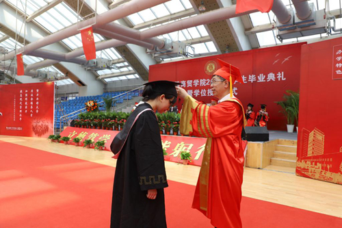 頒獎(jiǎng)儀式結(jié)束后,進(jìn)行了學(xué)位授予儀式,董事長(zhǎng)趙超和校長(zhǎng)張輝分別逐一為畢業(yè)生撥穗正冠,整個(gè)過(guò)程莊重威嚴(yán)又洋溢著濃郁的青春氣息。