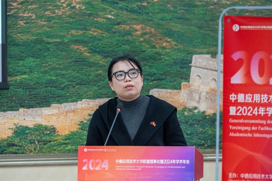 德國北黑森應(yīng)用技術(shù)大學(xué)校長紫玲教授致辭。她講到,雙方十多年來的合作辦學(xué)在各方的支持和努力下取得了非常好的成果。期待通過中德應(yīng)用技術(shù)大學(xué)聯(lián)盟的平臺,讓雙方的教育合作能夠更上一個(gè)層次。紫玲校長提出三點(diǎn)建議:一是希望加深和拓展雙方合作辦學(xué)的廣度與深度,能有更多的機(jī)會進(jìn)行對話和進(jìn)行切磋。二是希望雙方能夠在教師,包括研發(fā)領(lǐng)域,能夠通過聯(lián)盟這個(gè)平臺有更多的、更深入的、更寬廣的合作。三是不斷創(chuàng)新理論與實(shí)踐結(jié)合的教學(xué)方式,真正讓我們的學(xué)生學(xué)以致用,為中德兩國乃至世界做出他們自己的貢獻(xiàn)。