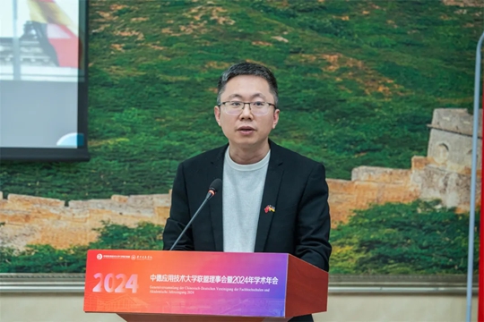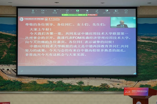 德國埃森經(jīng)濟(jì)管理應(yīng)用技術(shù)大學(xué)(FOM)的行政校長Dr. Beschorner(白瀟樂)博士致辭。白校長介紹了FOM大學(xué)的基本情況、培養(yǎng)目標(biāo)及輝煌成就,展望了中德應(yīng)用技術(shù)大學(xué)聯(lián)盟的美好未來,強(qiáng)調(diào)聯(lián)盟是兩國高等教育的歷史性握手。在未來的工作中,將以聯(lián)盟章程為準(zhǔn)則,充分發(fā)揮聯(lián)盟的平臺作用,推動中德高等教育領(lǐng)域內(nèi)的應(yīng)用型人才培養(yǎng)。他提出三點(diǎn)期望:一是深化教育合作,共享優(yōu)質(zhì)資源;二是加強(qiáng)產(chǎn)學(xué)研合作;三是促進(jìn)師生交流,培養(yǎng)國際視野。期待在聯(lián)盟成員的攜手努力下,共同書寫中德教育合作的新篇章,為推動兩國高等教育事業(yè)的發(fā)展作出更大的貢獻(xiàn)!