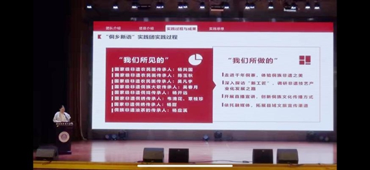 優(yōu)秀團隊代表—馬克思主義學(xué)院“侗鄉(xiāng)新語”實踐團學(xué)生代表霍子樂分享實踐團走進廣西三江侗族自治縣,團隊成員將自己的所思所學(xué),匯聚到傳播侗繡、侗歌、農(nóng)民畫等國家級非物質(zhì)文化遺產(chǎn),開展助農(nóng)直播和文化宣講,有效提升了三江非遺的知名度和美譽度。