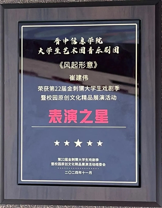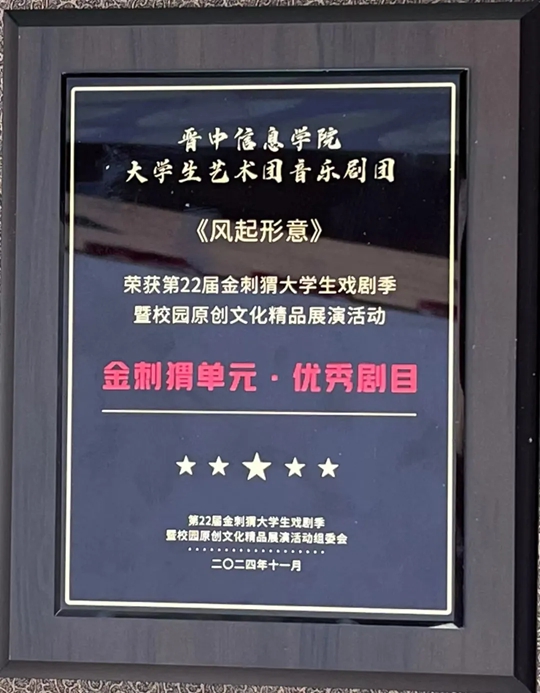 在十一月的尾聲,第22屆金刺猬大學(xué)生戲劇季暨校園原創(chuàng)文化精品展演活動(原中國大學(xué)生戲劇節(jié))落下帷幕。晉中信息學(xué)院的原創(chuàng)音樂劇《風(fēng)起形意》在全國139部作品中脫穎而出,榮獲“優(yōu)秀劇目獎(jiǎng)”(全國僅10部獲獎(jiǎng))和“表演之星”兩個(gè)重量級獎(jiǎng)項(xiàng),以其獨(dú)特的藝術(shù)魅力和精湛的演出技藝贏得了廣泛贊譽(yù)。這一榮譽(yù)不僅是對《風(fēng)起形意》創(chuàng)作團(tuán)隊(duì)辛勤努力的肯定,更是對晉中信息學(xué)院在藝術(shù)教育和文化創(chuàng)新方面實(shí)力的認(rèn)可。
