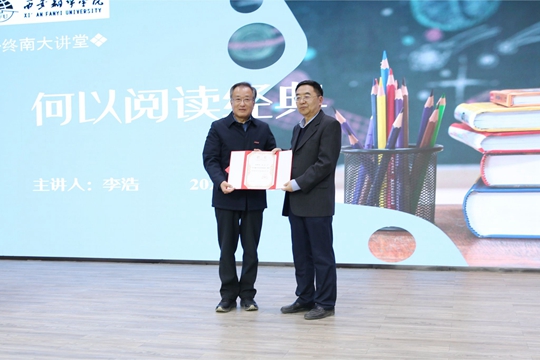 3月21日下午,西安翻譯學(xué)院文學(xué)與傳媒學(xué)院邀請教育部長江學(xué)者、西北大學(xué)中國文化研究中心主任、中國唐代文學(xué)學(xué)會會長李浩教授在終南大講堂作題為“何以閱讀經(jīng)典”的學(xué)術(shù)講座。西安翻譯學(xué)院執(zhí)行董事、校長崔智林出席,并為李浩教授頒發(fā)了西安翻譯學(xué)院特聘教授證書。西安翻譯學(xué)院文學(xué)與傳媒學(xué)院院長亢西民主持,李家寶教授等中國語言文學(xué)系教師與學(xué)生共享盛宴。