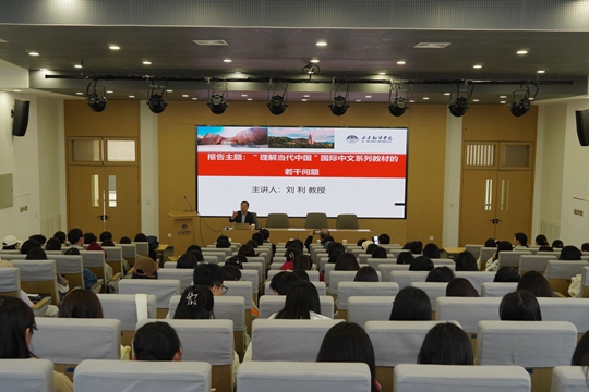 在報(bào)告中,劉利教授主要圍繞“探索新路徑”“秉持新理念”“謀劃新設(shè)計(jì)”“實(shí)現(xiàn)新作為”四個(gè)主題,向老師和同學(xué)們介紹了“理解當(dāng)代中國”系列教材中的《高級(jí)中文聽說教程》和《高級(jí)中文讀寫教程》。作為留學(xué)生的語言訓(xùn)練素材,這一系列教材突破了現(xiàn)有教學(xué)體系,在“了解當(dāng)代中國”這一大課題下實(shí)現(xiàn)了“中文·國情”的融合。劉利教授指出,系列教材承擔(dān)了幫助來華留學(xué)生認(rèn)知當(dāng)代中國、提升中文水平的雙重任務(wù),因此教材立意既要介紹、闡釋中國,引導(dǎo)學(xué)生正確認(rèn)識(shí)中國,也要強(qiáng)化學(xué)術(shù)中文教學(xué),促進(jìn)學(xué)生中文水平的提高。
