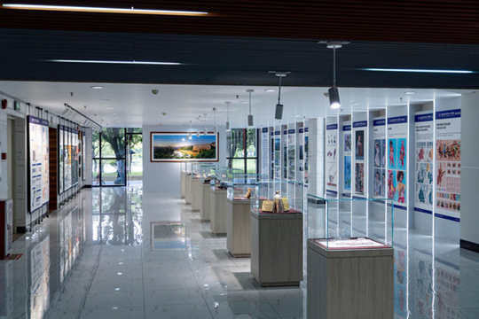 黨建思政育人基地位于行政樓一、二層,占地1330.56平方米,是立體化呈現(xiàn)黨史校史融合育人的重要平臺,形成“可聽可觸可感”的思政教育新范式。一樓展館由“璀璨的中華文明”“光輝的奮斗歷程”“廣東紅色印記”“習(xí)近平新時代中國特色社會主義思想”“習(xí)近平總書記關(guān)于教育的重要論述(摘編)”“中國共產(chǎn)黨人精神譜系”“加強黨對學(xué)校工作的全面領(lǐng)導(dǎo)”“落實立德樹人根本任務(wù)”等8個板塊組成,前6個部分系統(tǒng)構(gòu)建了從歷史縱深到時代擔(dān)當(dāng)、從思想引領(lǐng)到實踐方略的完整邏輯鏈條,展陳內(nèi)容展現(xiàn)了中華文明的賡續(xù)與黨的奮斗光輝,闡釋了習(xí)近平新時代中國特色社會主義思想的實踐偉力;后2個部分展現(xiàn)了學(xué)校在落實黨的全面領(lǐng)導(dǎo),確保黨的教育事業(yè)始終沿著正確方向前進(jìn)的生動實踐。二樓展館由“創(chuàng)始人”“歷任領(lǐng)導(dǎo)”“傳承沿革”“領(lǐng)導(dǎo)關(guān)懷”“黨建引領(lǐng)”“人才培養(yǎng)”“師資隊伍”“國際交流”等14個板塊組成,以沉浸式展陳方式,全景呈現(xiàn)了學(xué)校二十載辦學(xué)歷程、辦學(xué)成果與育人成效,通過豐富的圖文資料和實物展品,直觀感受學(xué)校在人才培養(yǎng)、科研創(chuàng)新、社會服務(wù)等方面取得的豐碩成果。